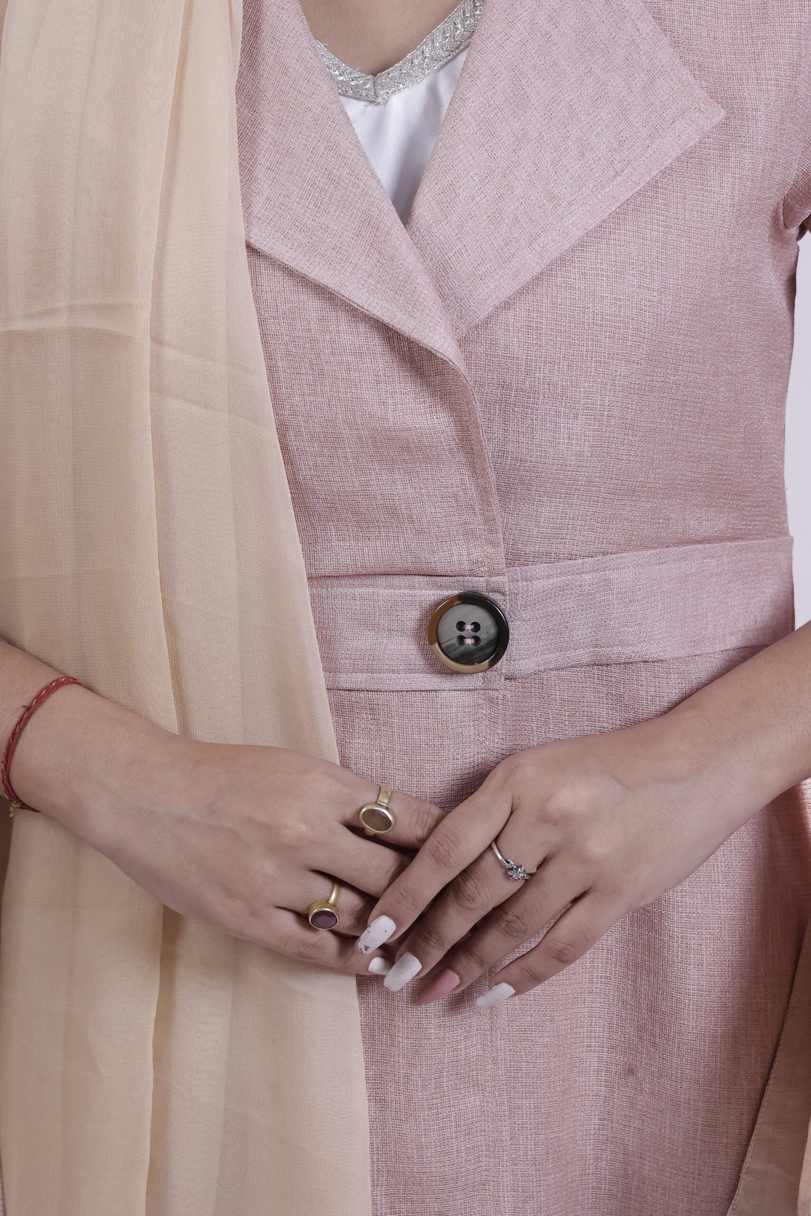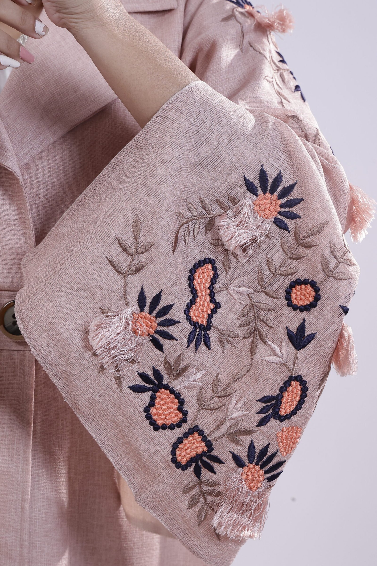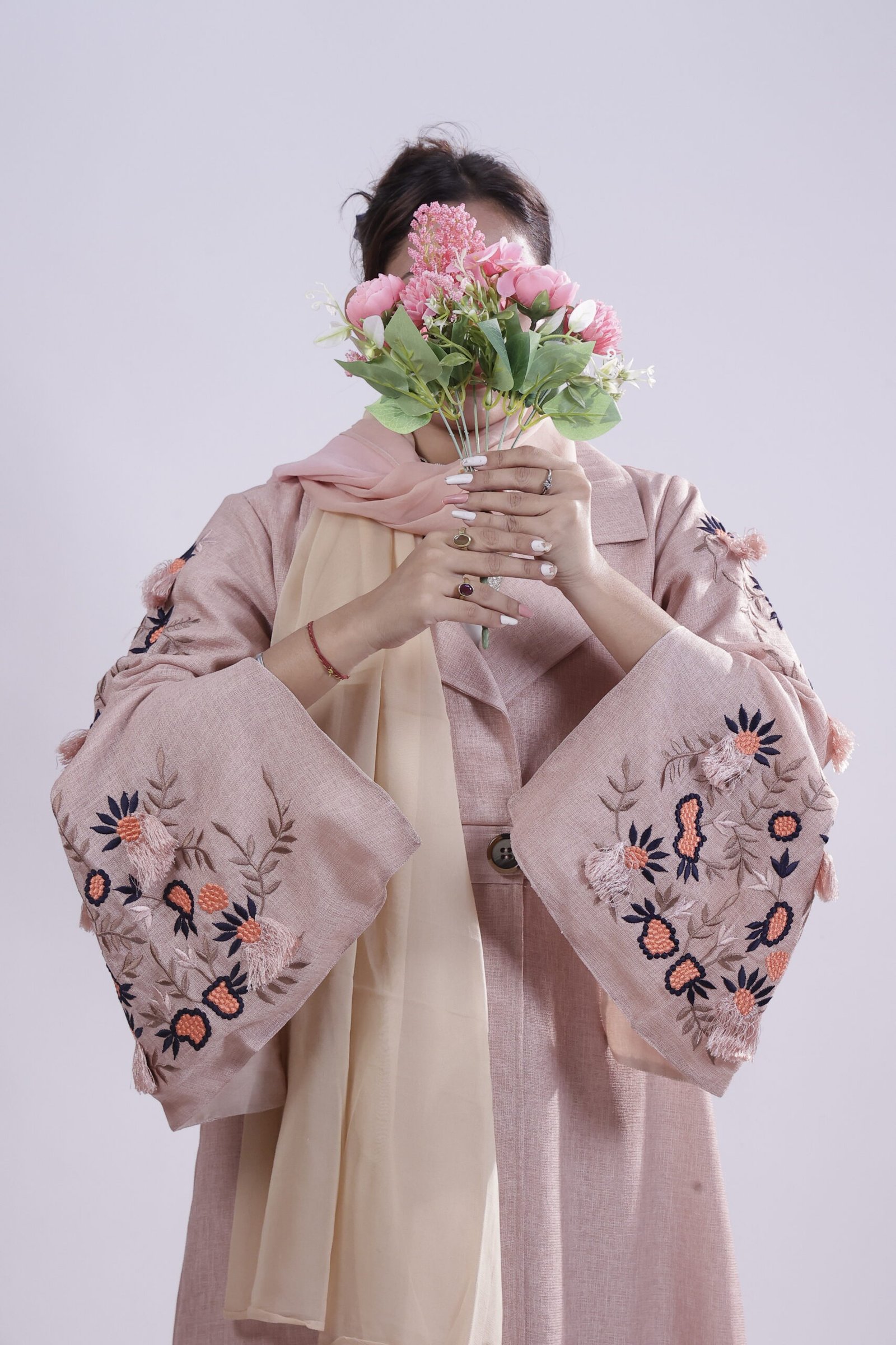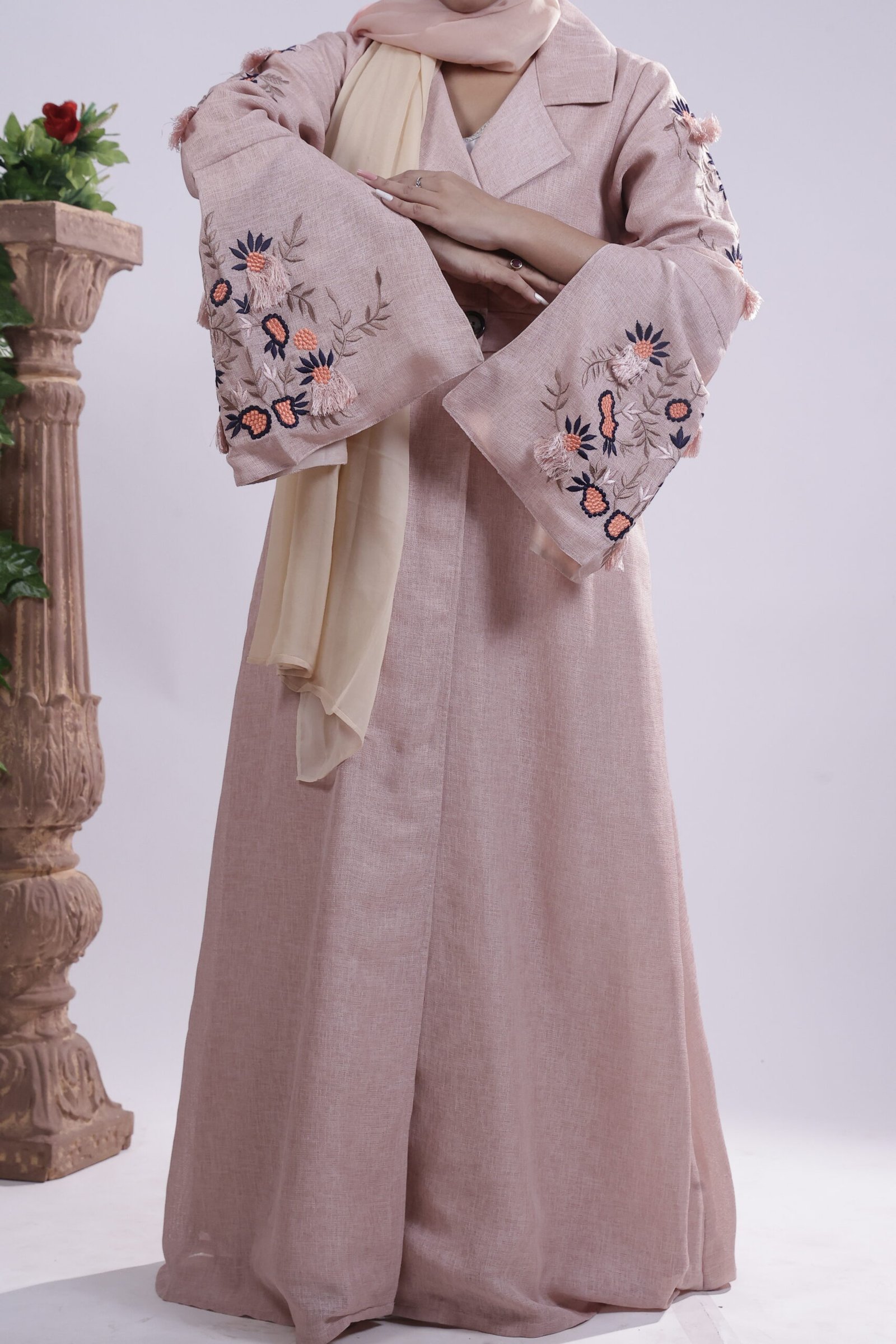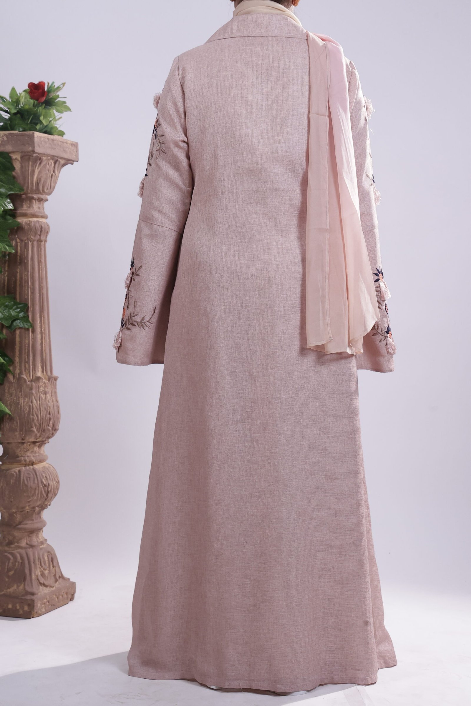 Echoing vintage garden romance this blush-brown jute abaya, tailored in a structured, coat-style cut, is adorned with delicate floral embroidery on flared sleeves, blending earthy texture with quiet elegance.