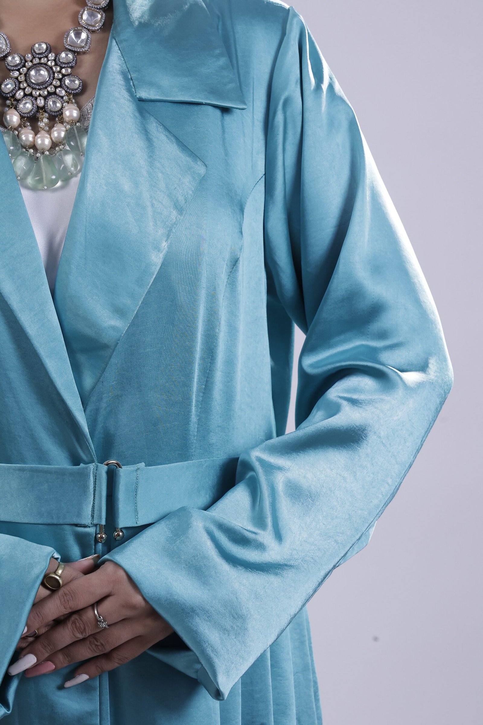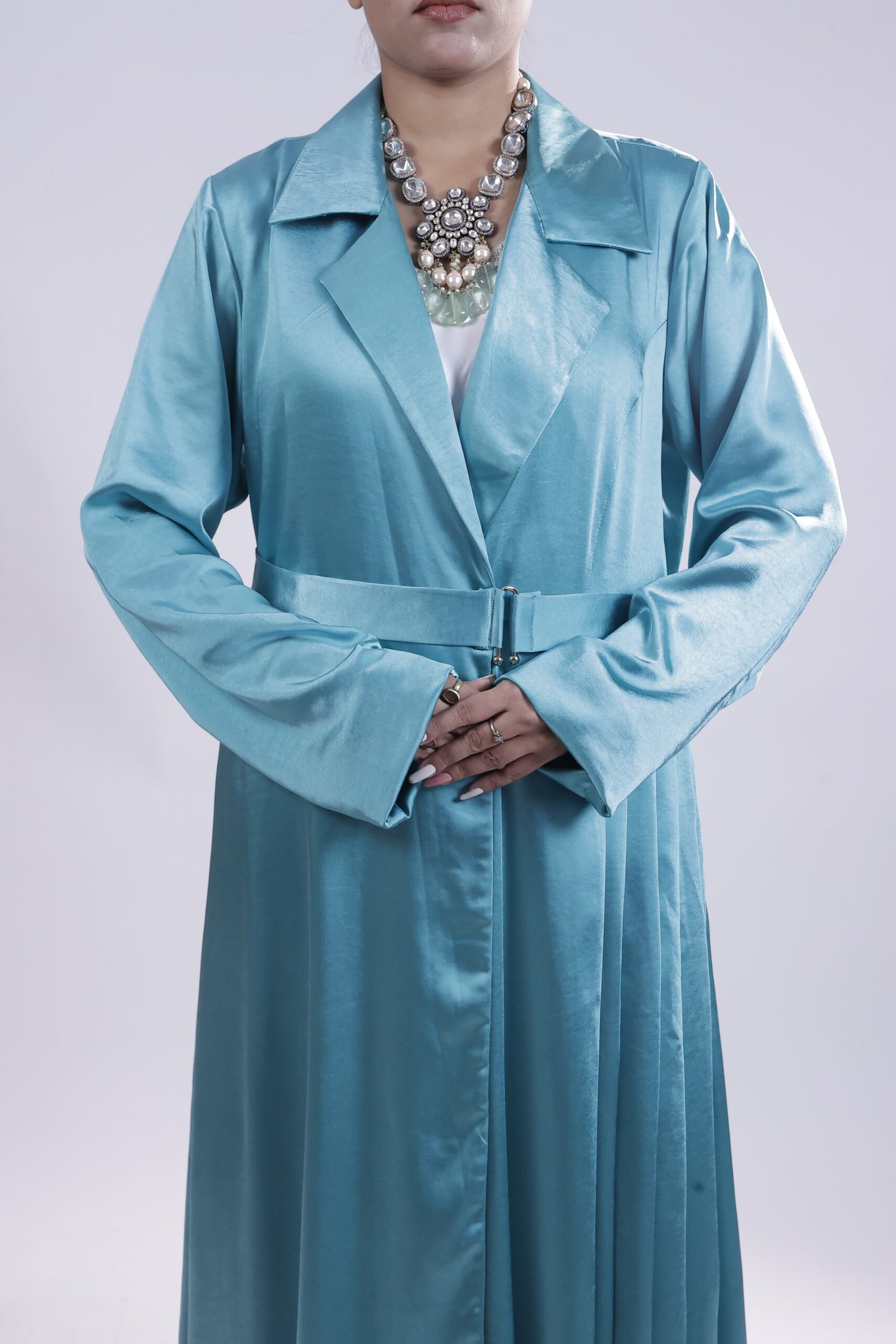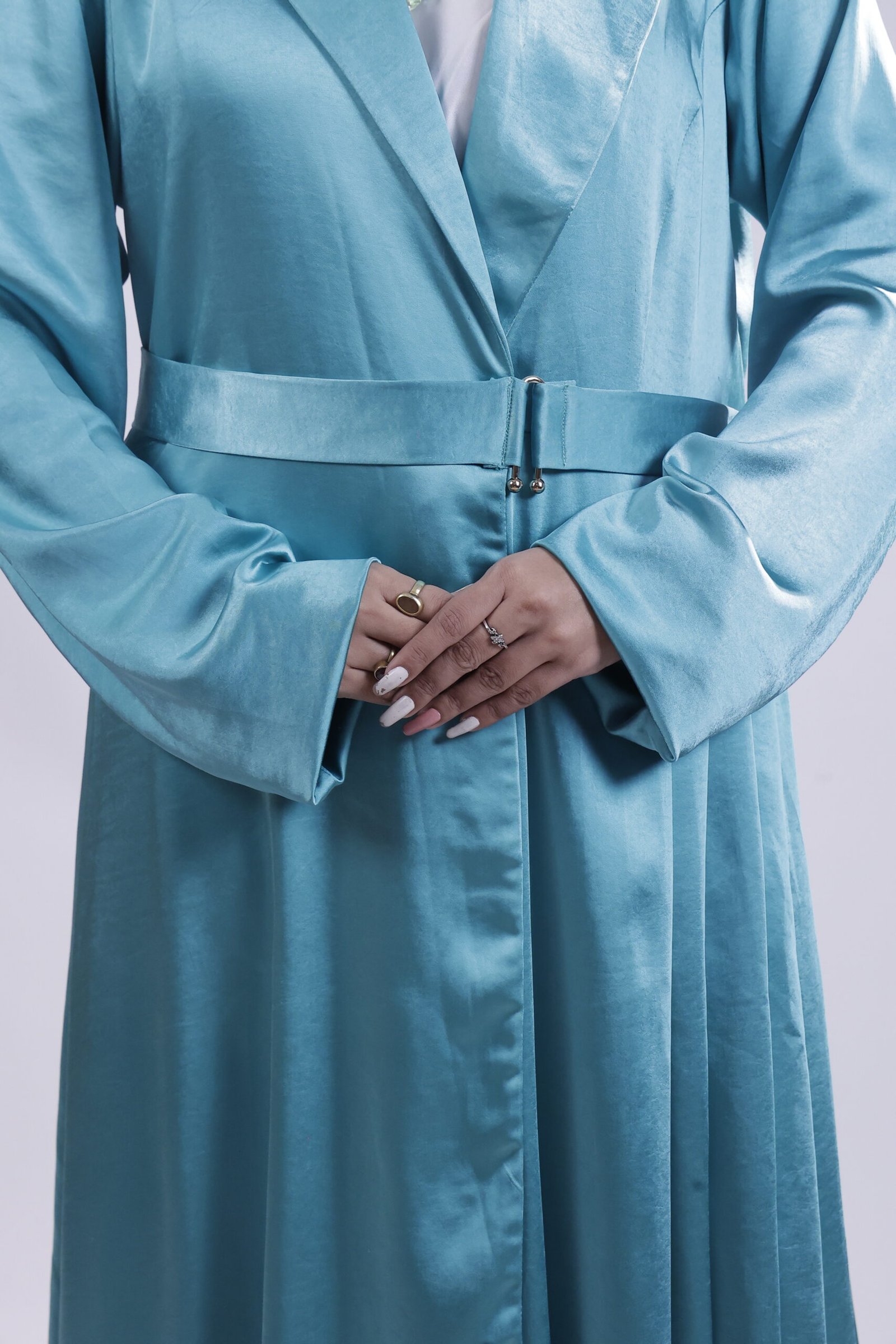 Inspired by Riviera elegance, this teal abaya mirrors refined tailoring with a sculpted lapel and defined waist. The elongated cut and fluid pleats create a sleek vertical line, while its satin sheen lends a subtle glow. Polished, modern, distinctly couture..