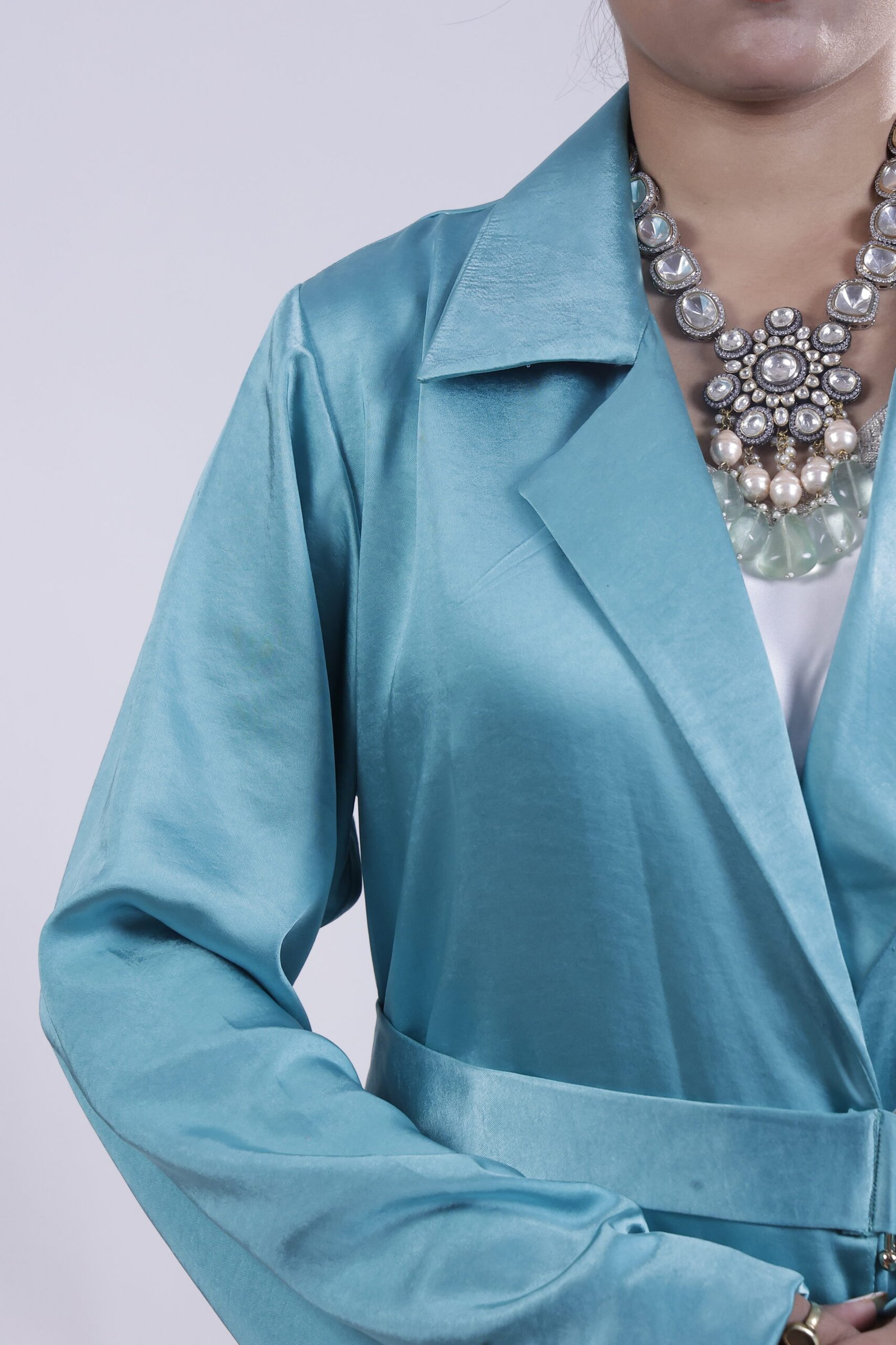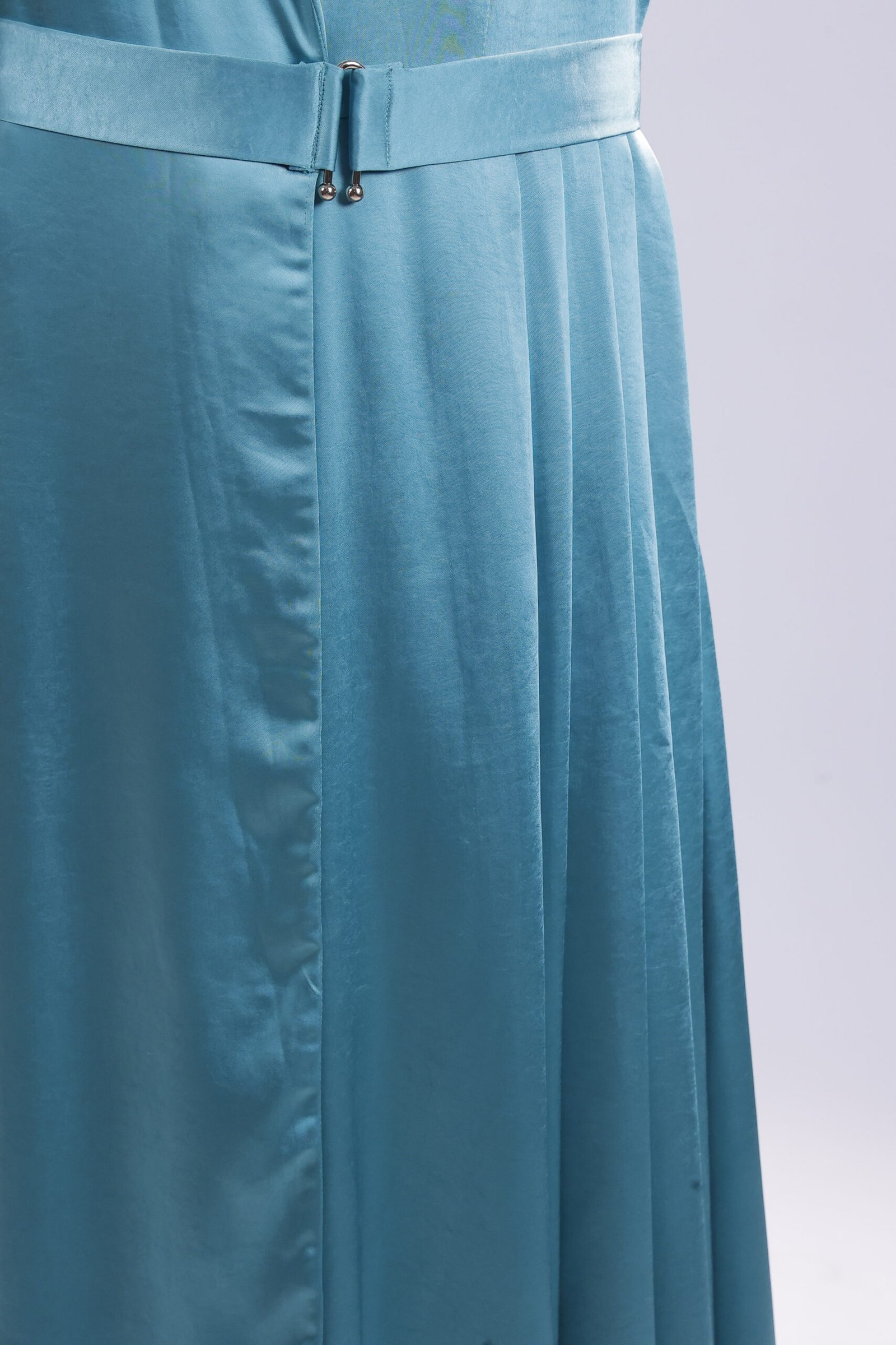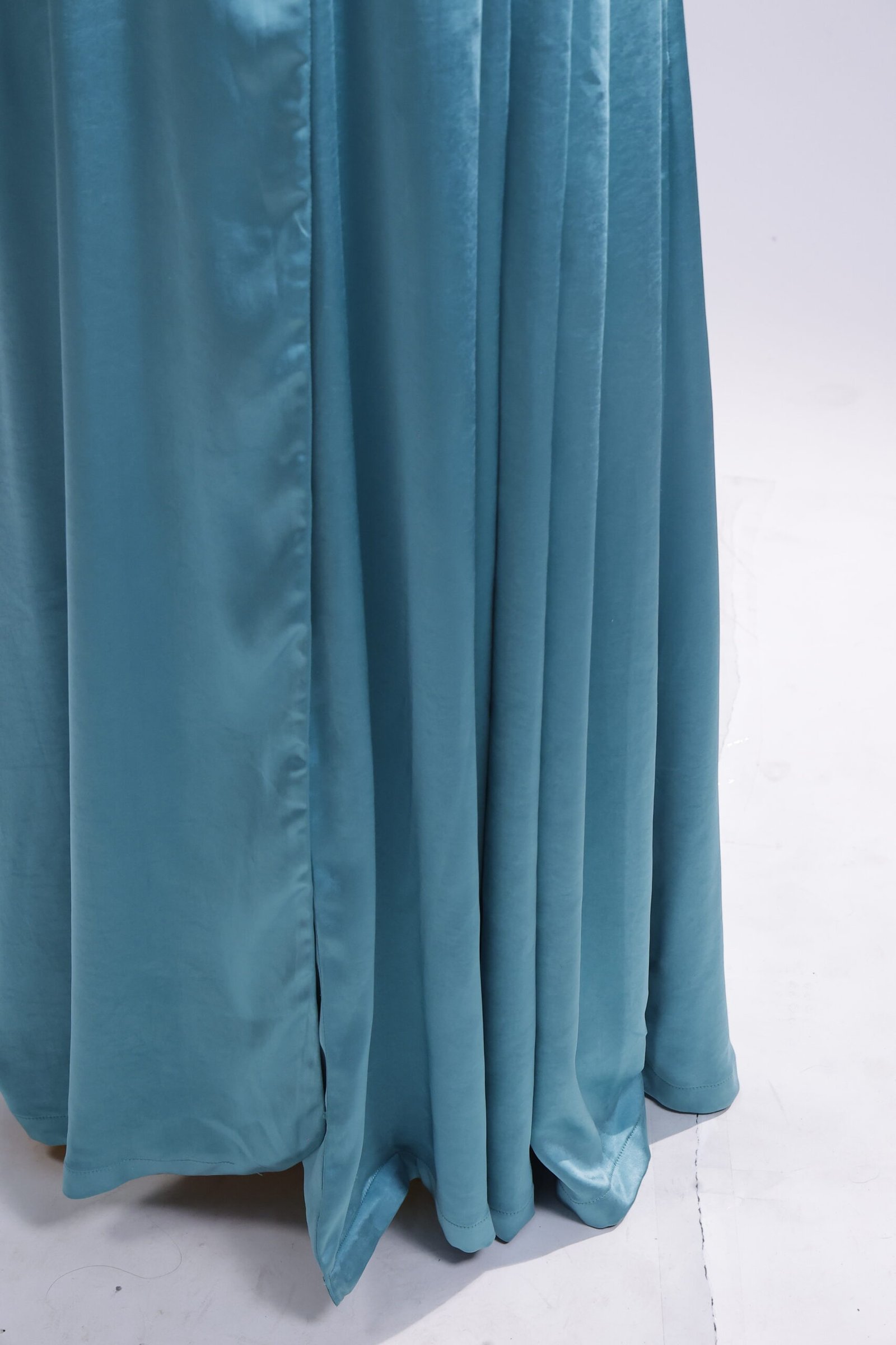 Inspired by Riviera elegance, this teal abaya mirrors refined tailoring with a sculpted lapel and defined waist. The elongated cut and fluid pleats create a sleek vertical line, while its satin sheen lends a subtle glow. Polished, modern, distinctly couture..