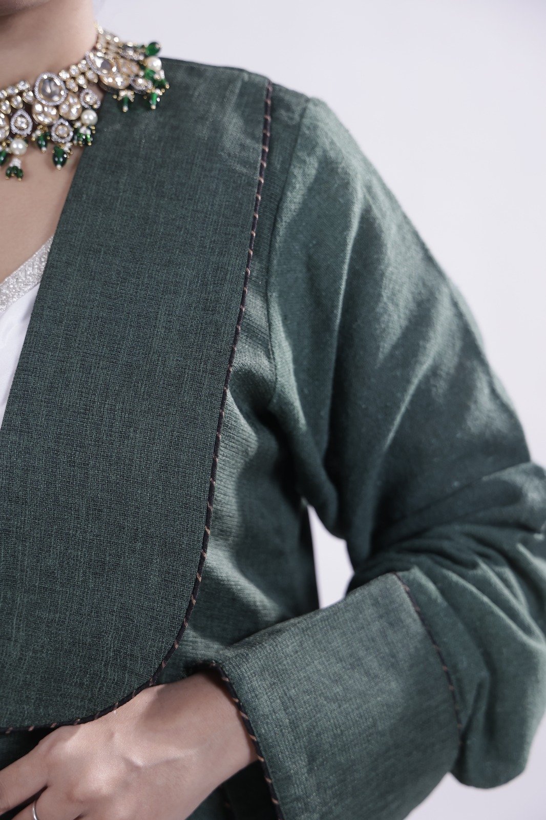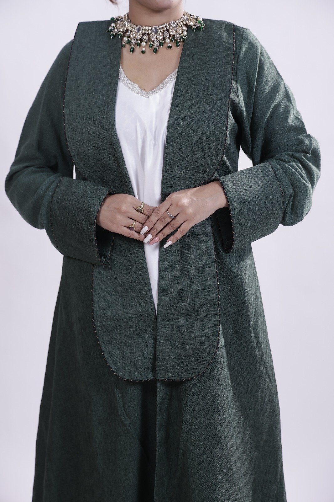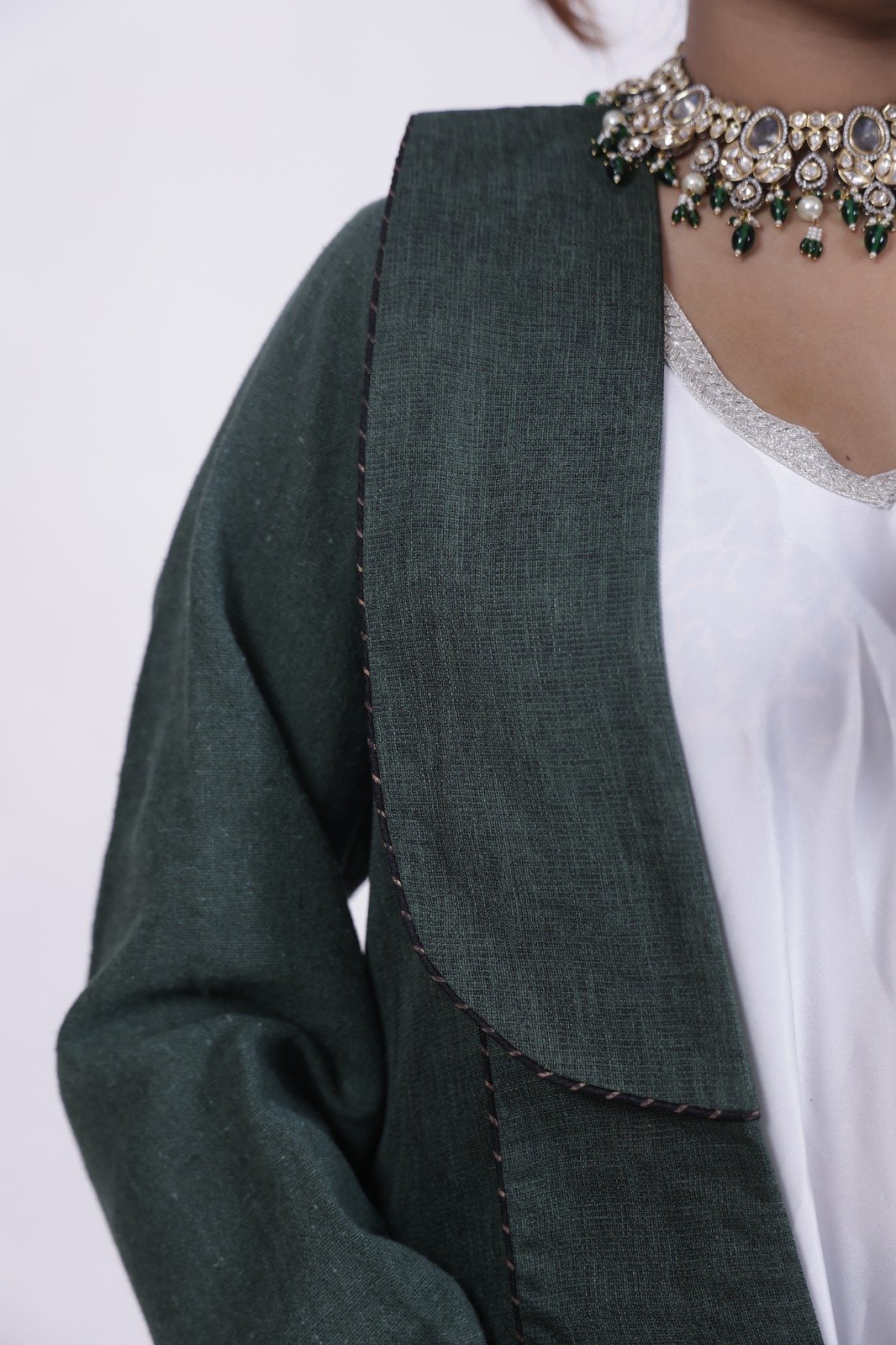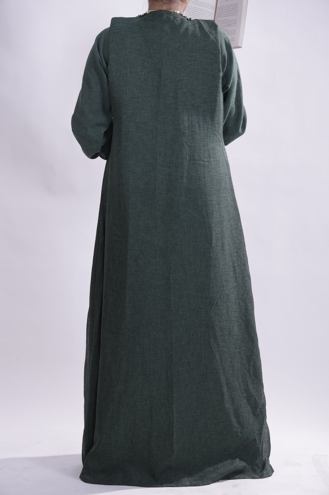 Inspired by royal evening gardens and timeless femininity, this emerald abaya features a fluid straight cut with graceful Intricate floral embroidered on lapel adds depth and artistry, creating a look that is both majestic and effortlessly refined.