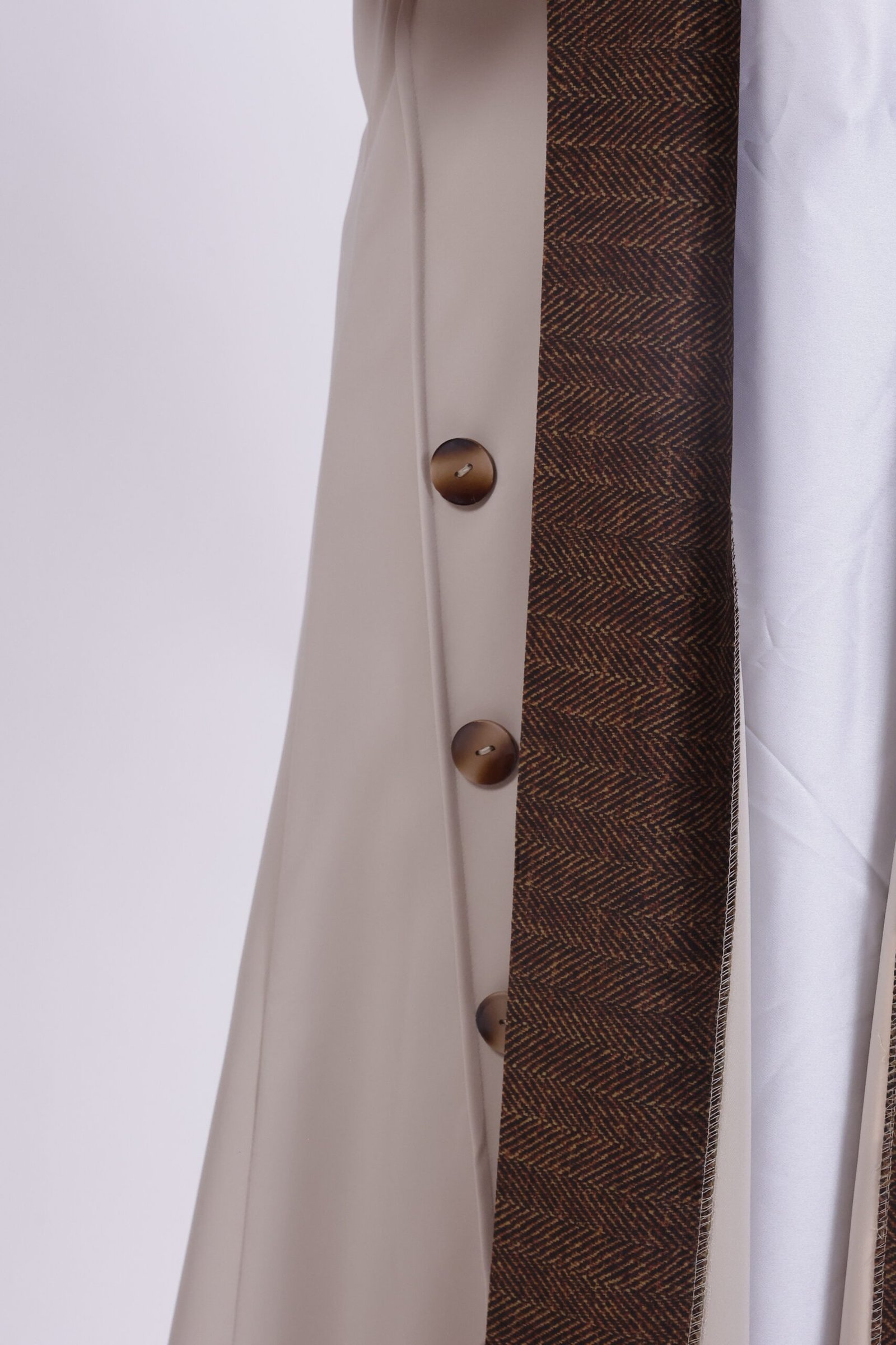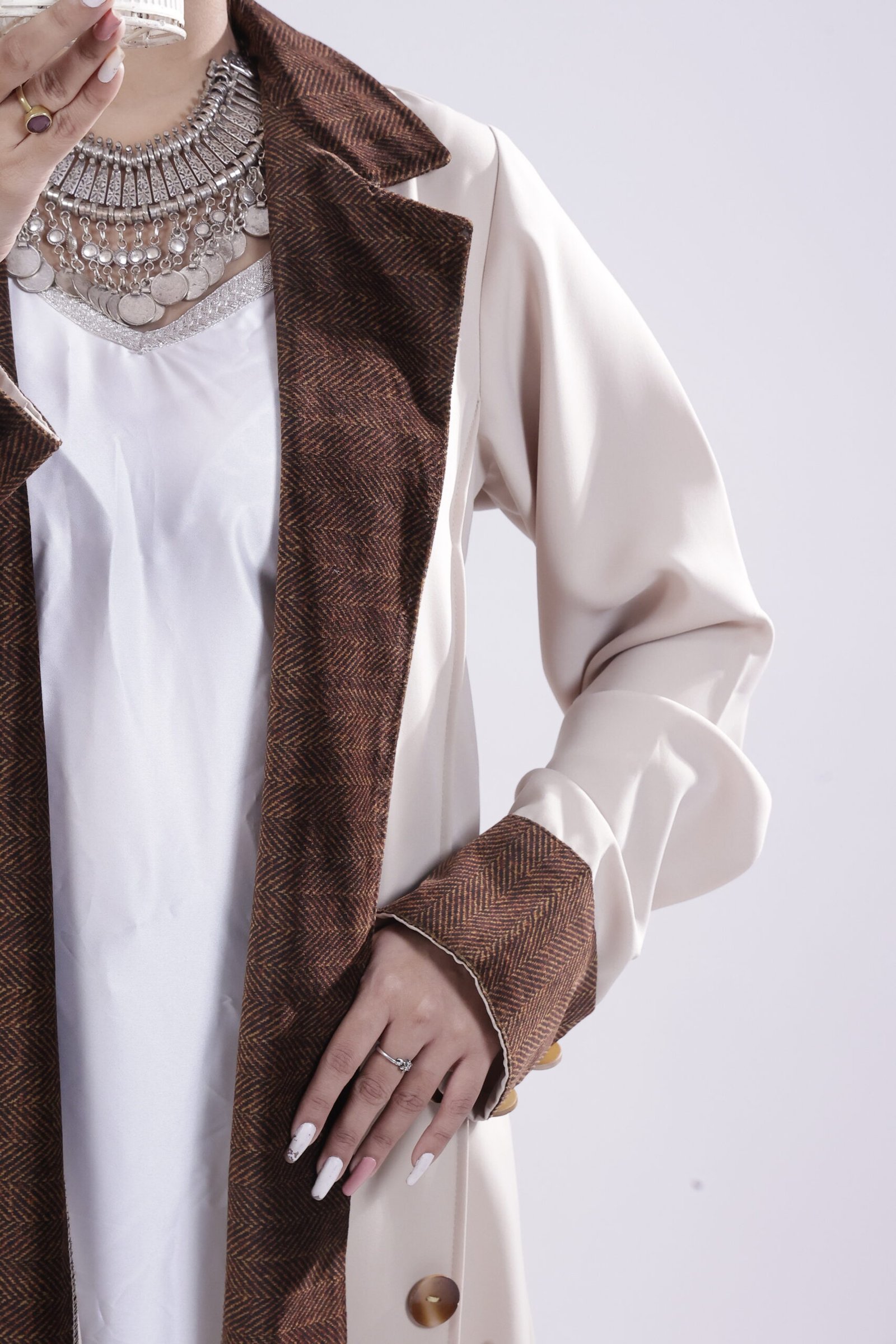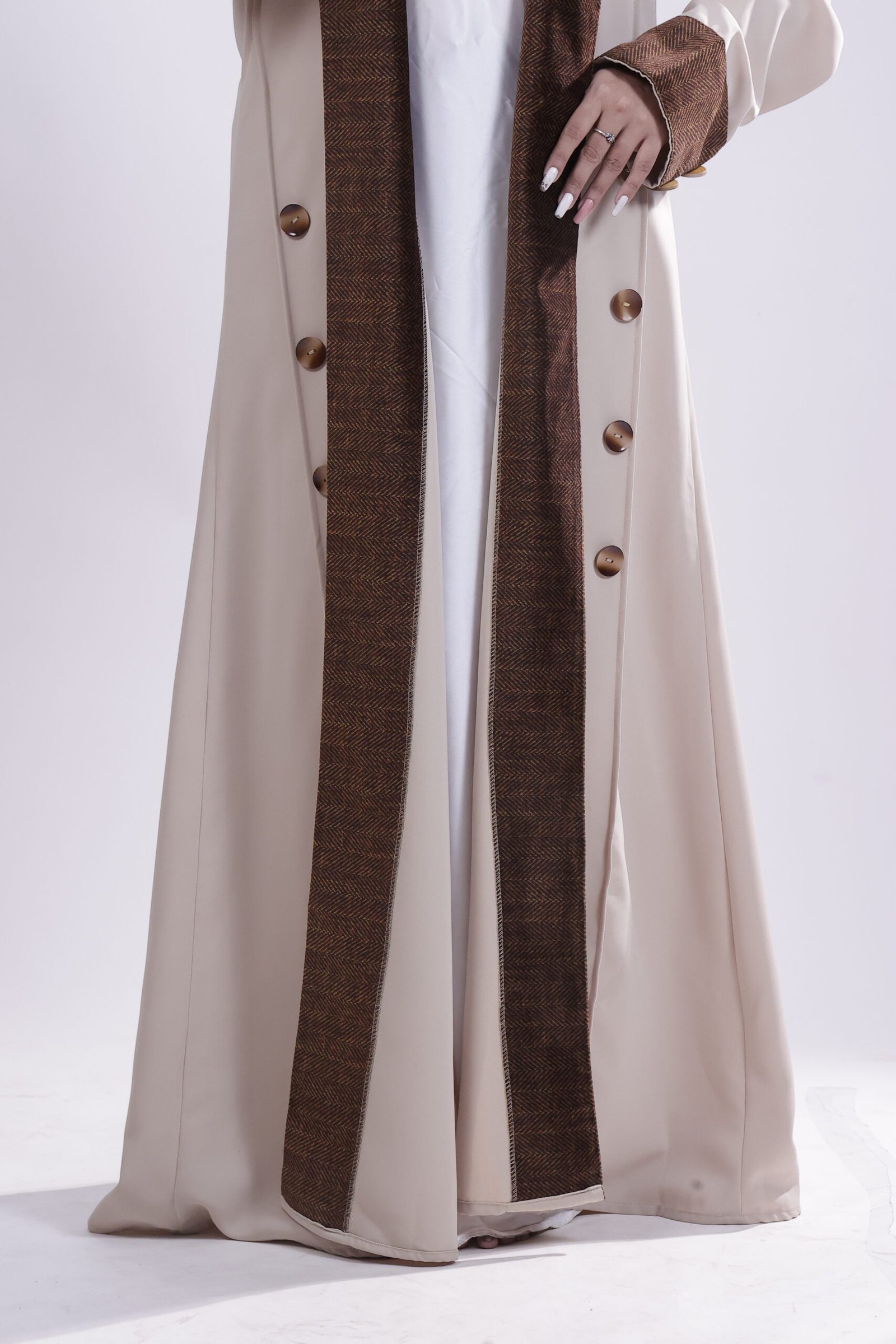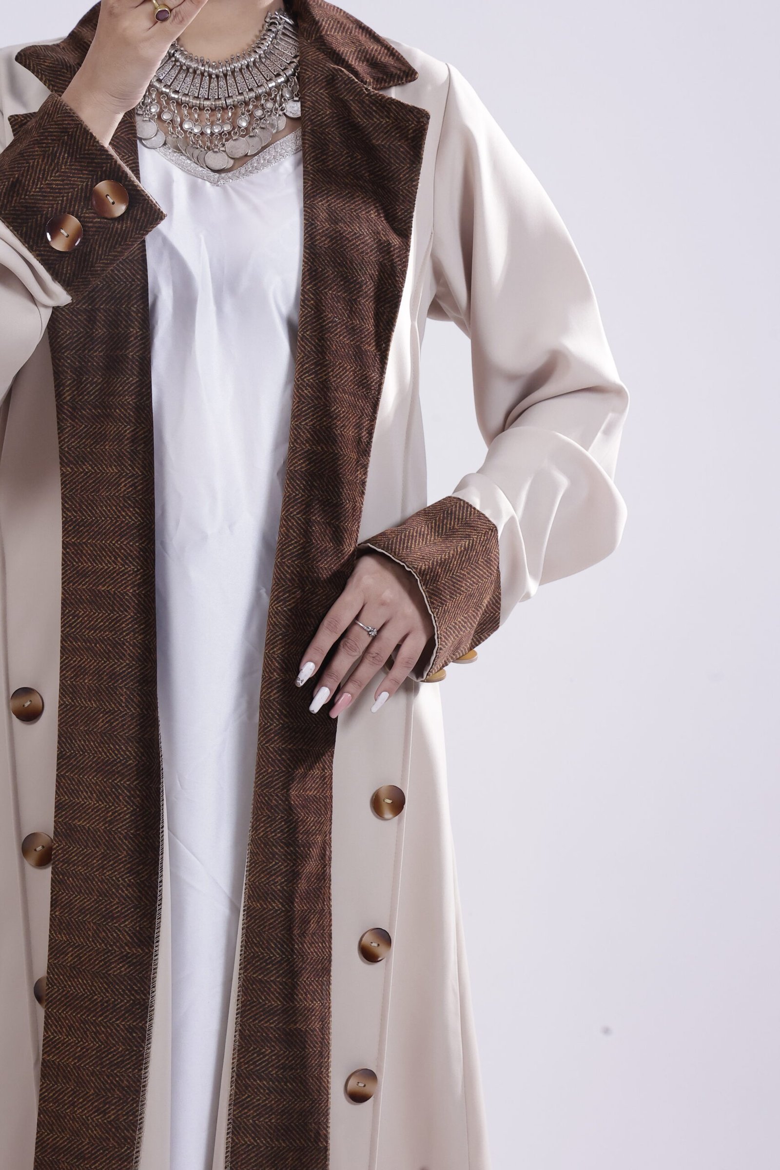 Inspired from vintage heritage tailoring this abaya is a fusion of contrast and craftsmanship, featuring a tailored coat-style cut in soft beige, elevated with rich velvet textured panels and statement buttons. Reimagined for modern modesty.
