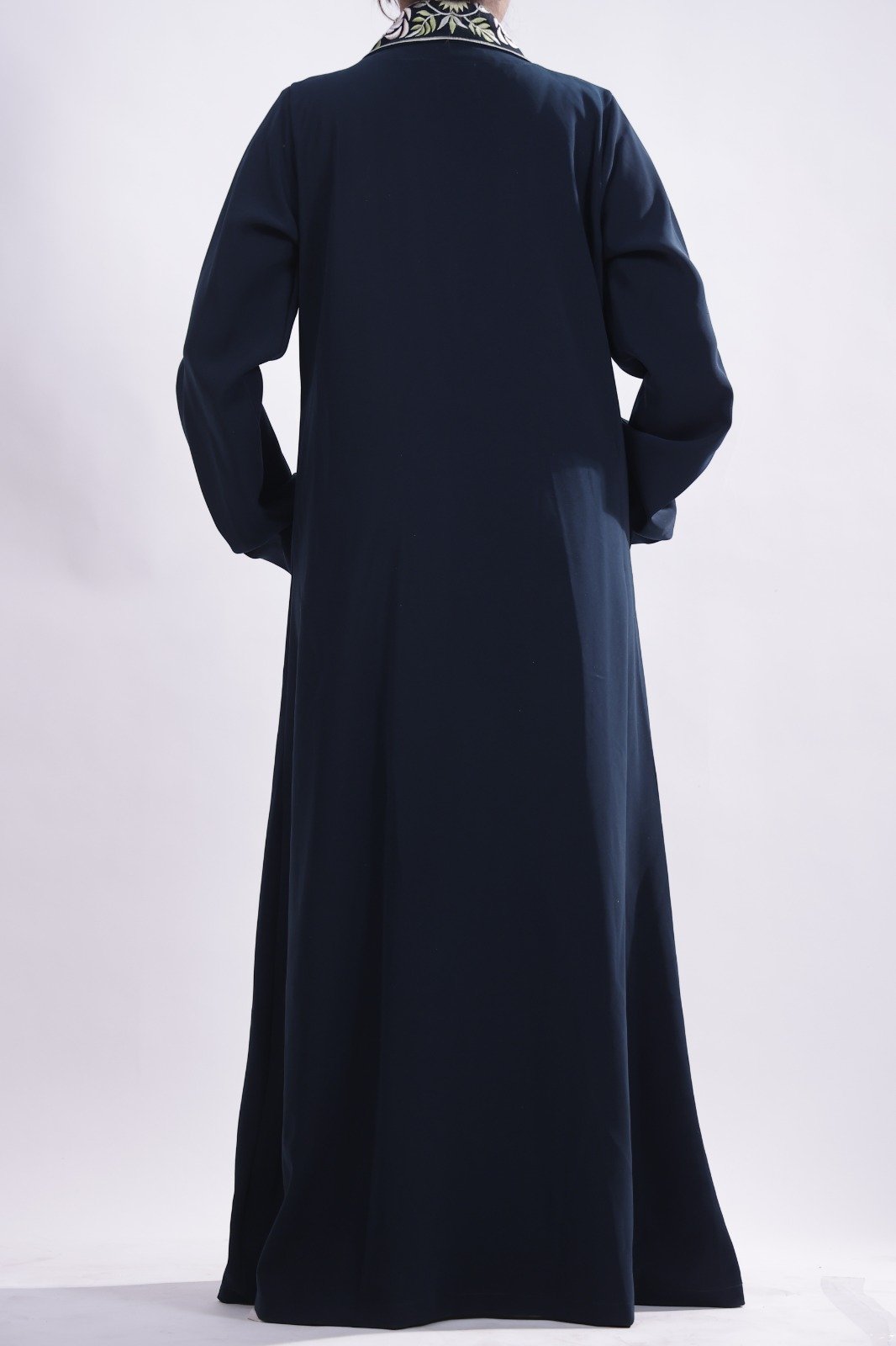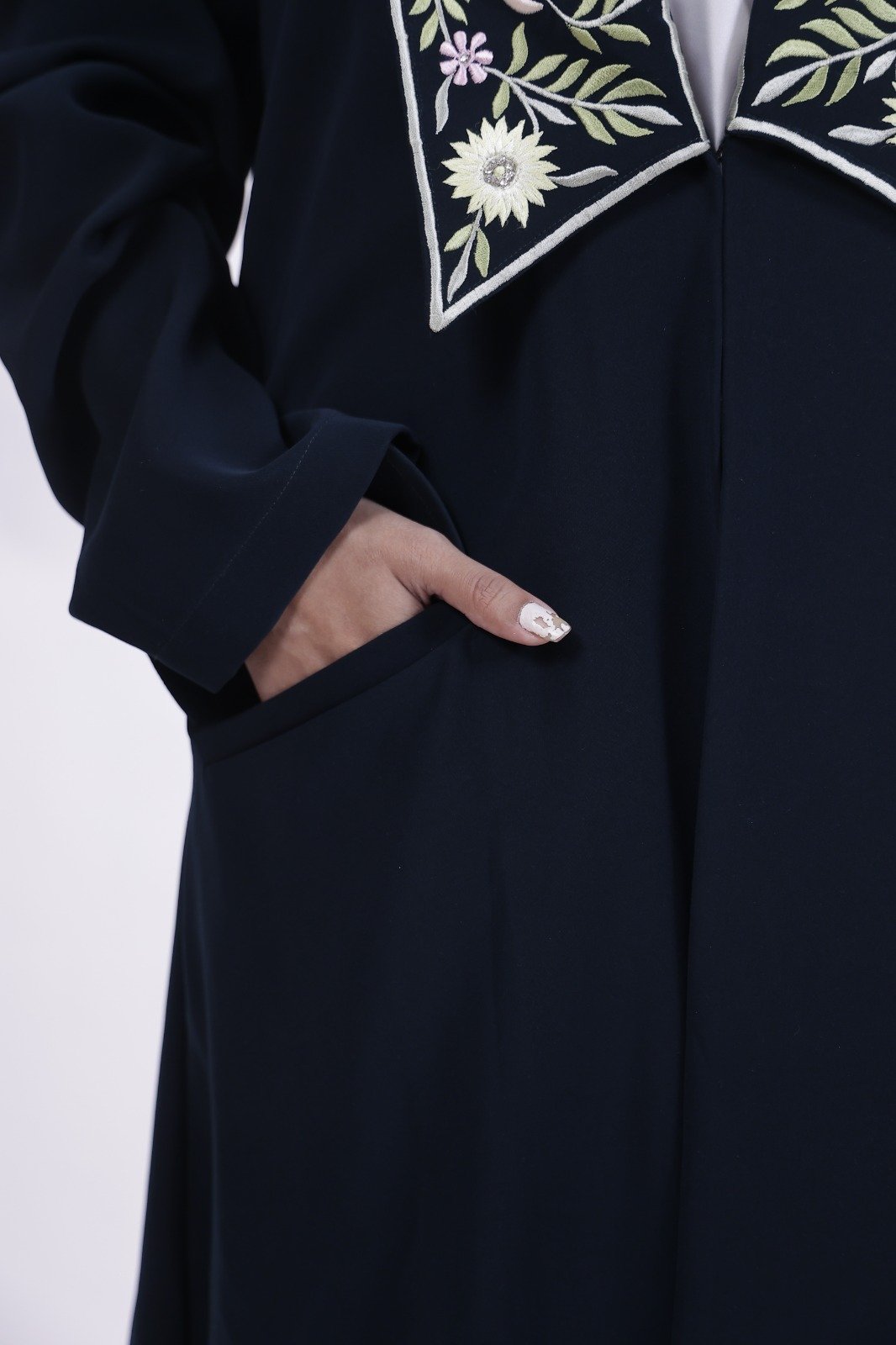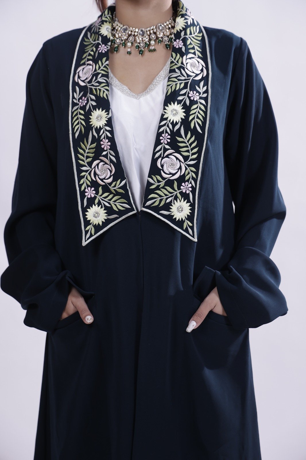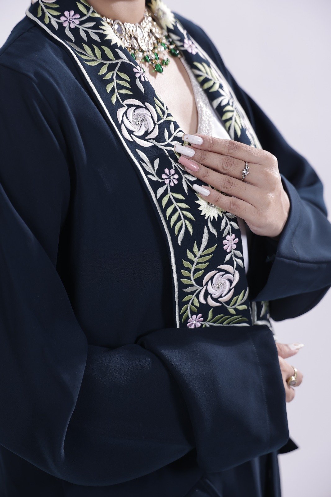 Open-Front Coat Style Abaya, Embellished With Detailed Floral Embroidery On The Lapel.