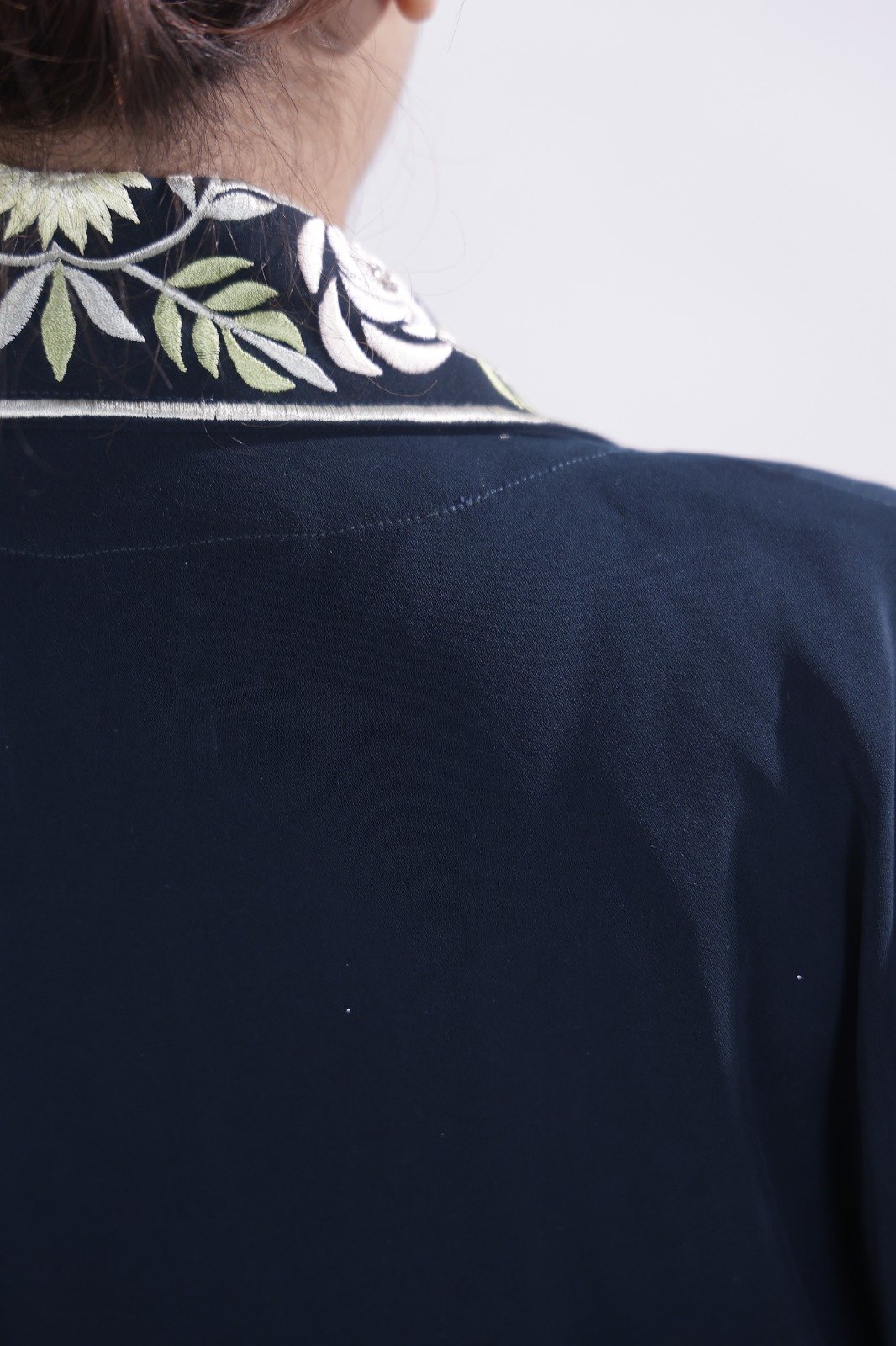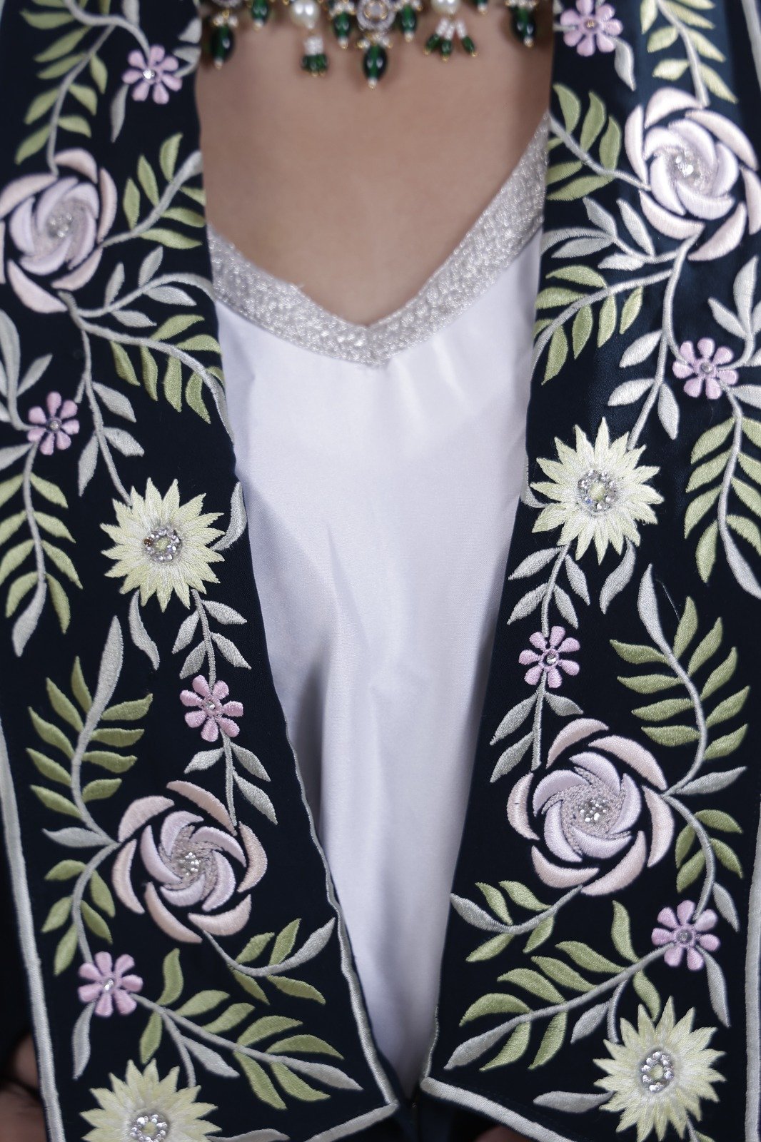 Inspired by royal evening gardens and timeless femininity, this emerald abaya features a fluid straight cut with graceful Intricate floral embroidered on lapel adds depth and artistry, creating a look that is both majestic and effortlessly refined.