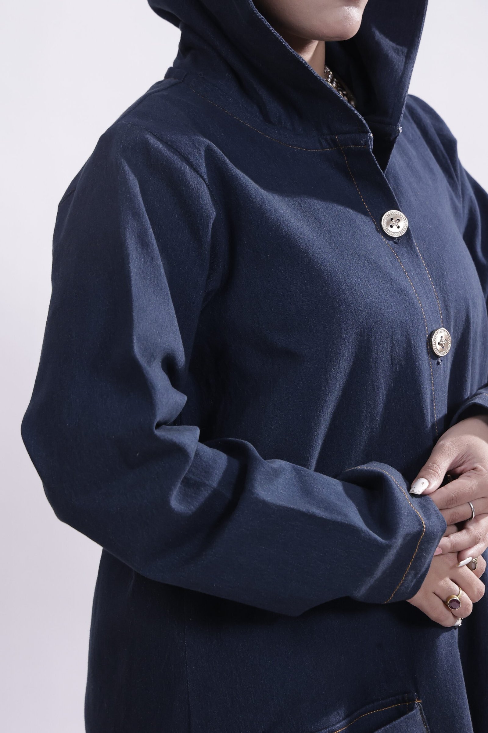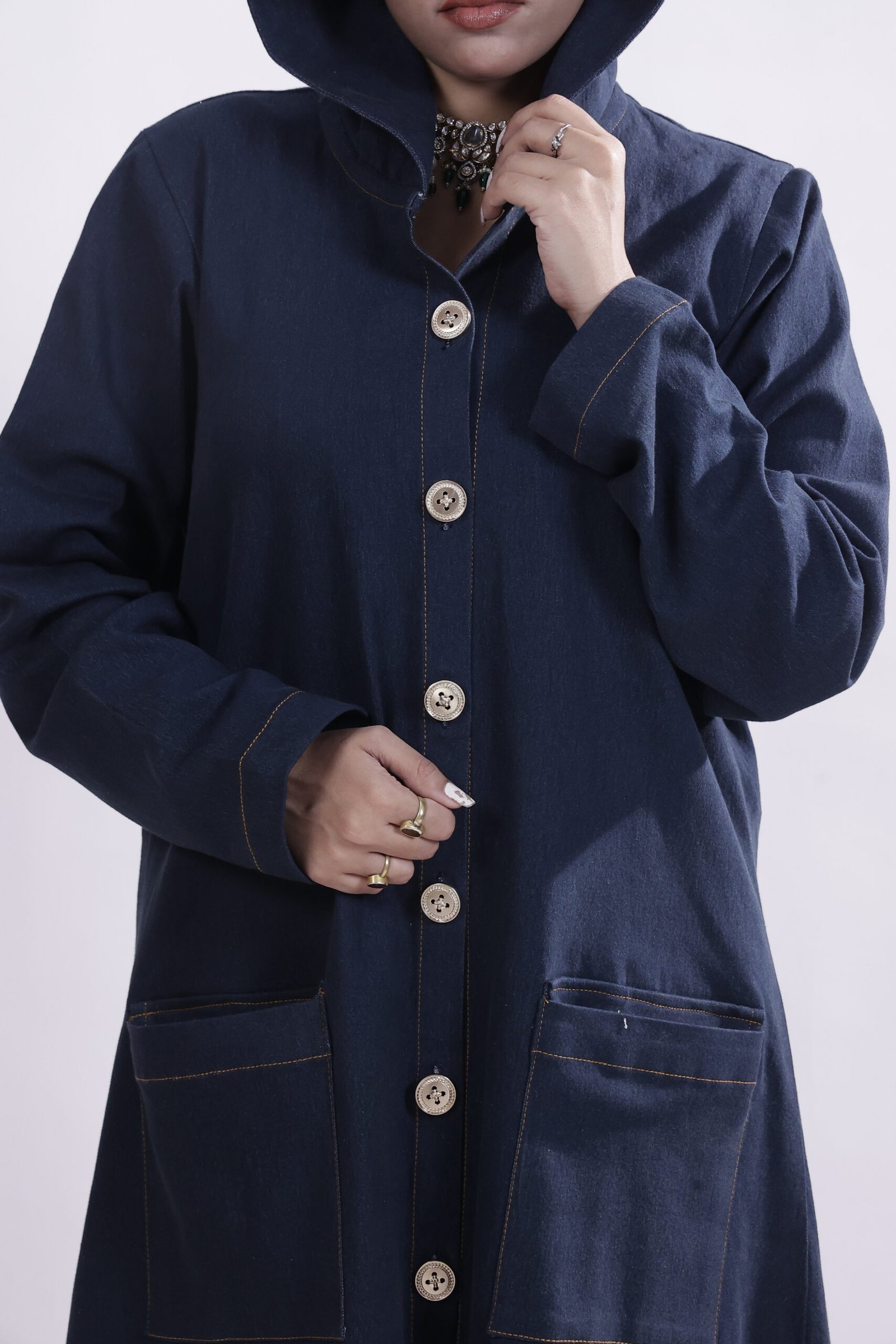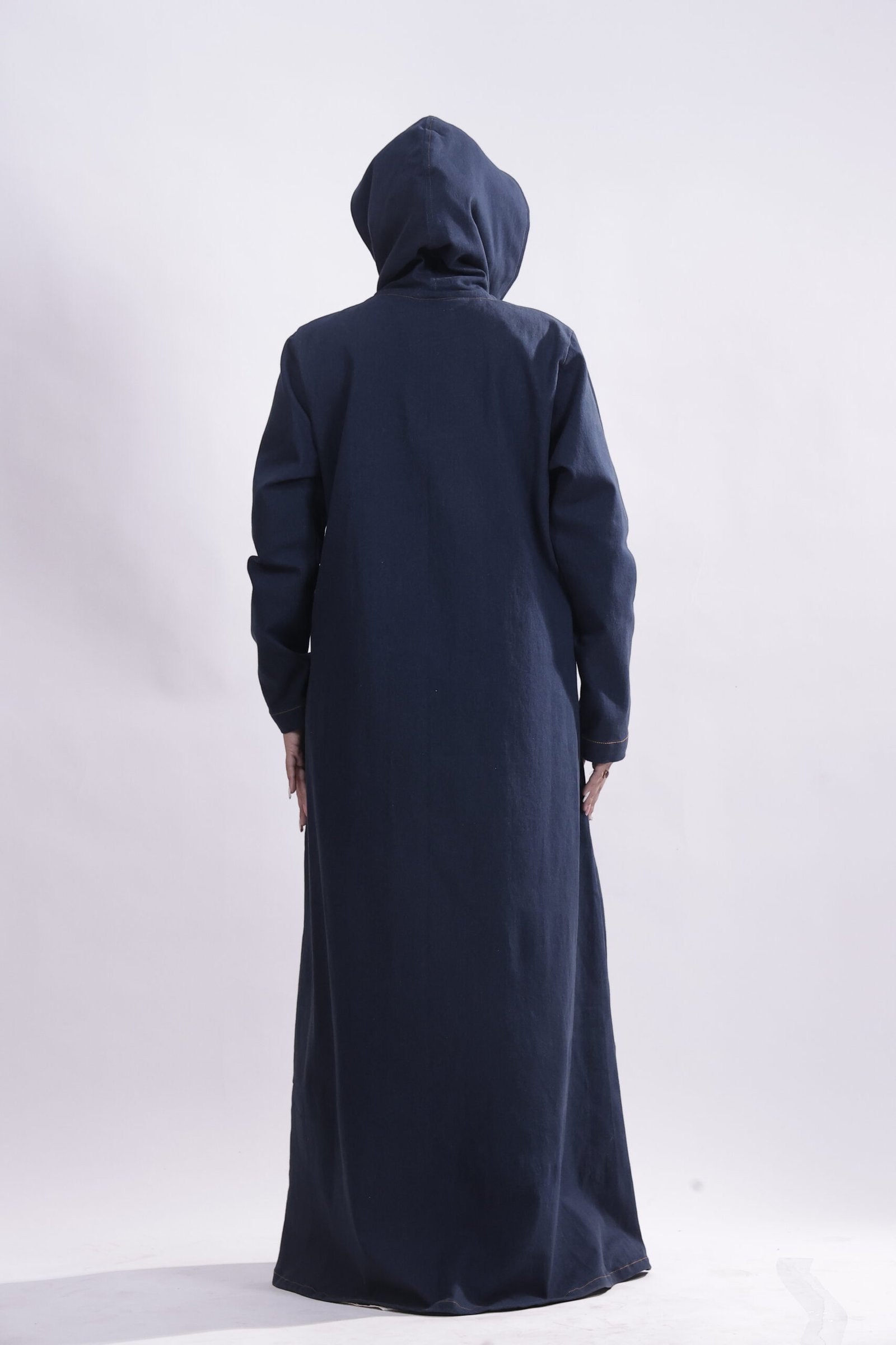Inspired by urban minimalism, this denim-blue hooded abaya channels understated strength with a modern edge. Cut in a clean, structured silhouette, it features subtle button detailing, while the denim-textured fabric adds refined, everyday ease.