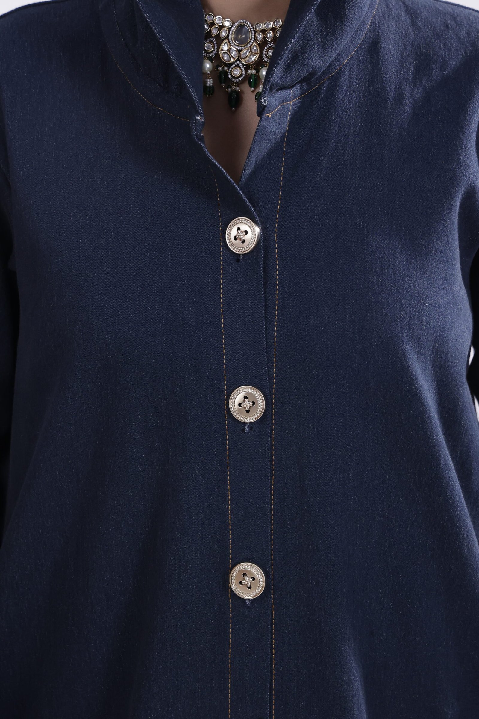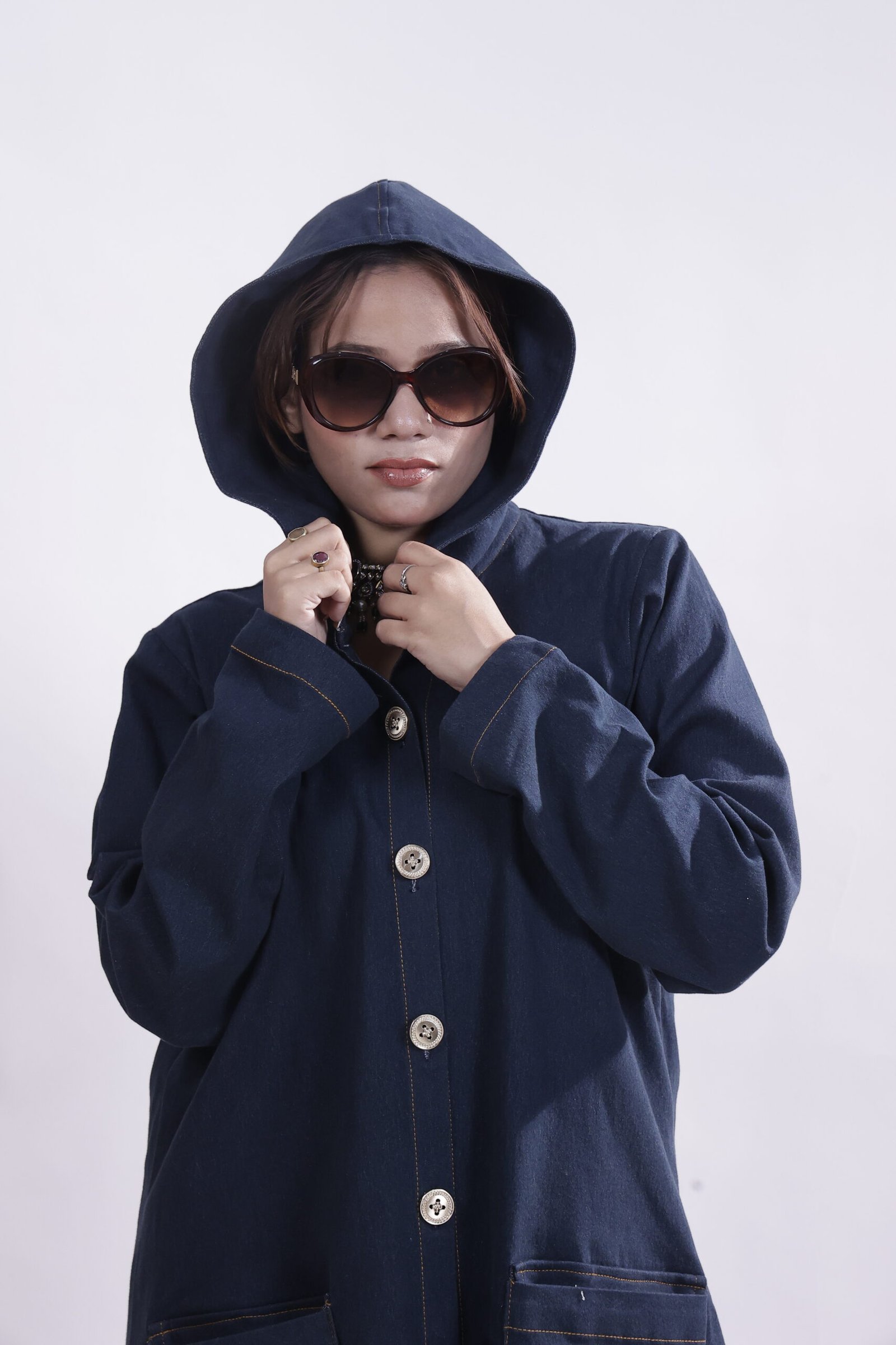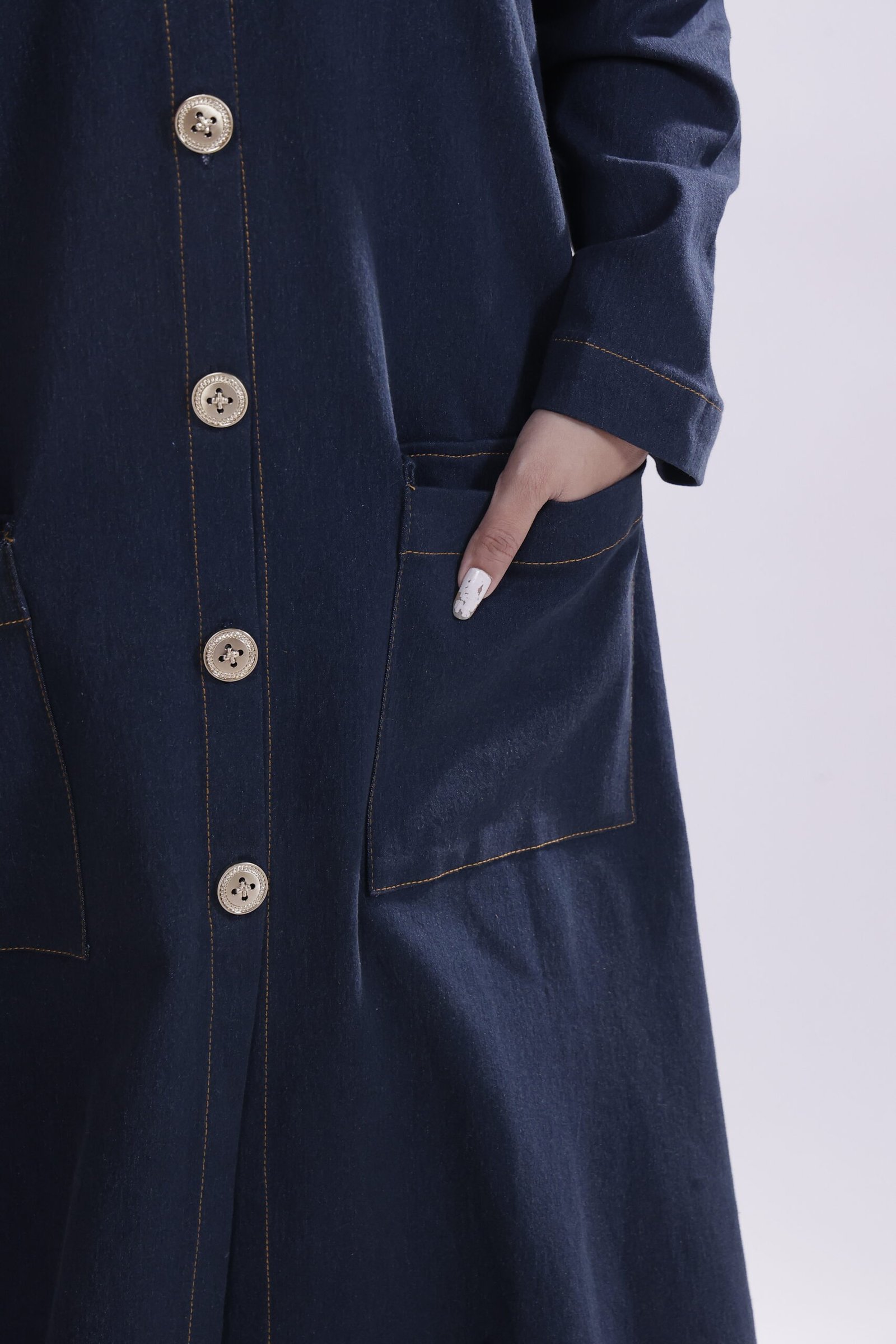 Inspired by urban minimalism, this denim-blue hooded abaya channels understated strength with a modern edge. Cut in a clean, structured silhouette, it features subtle button detailing, while the denim-textured fabric adds refined, everyday ease.